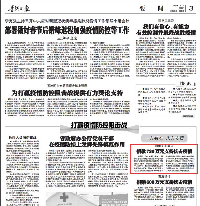 本报讯 (记者 钟倩) 1月31日,西部矿业集团有限公司向省红十字会捐款730万元用于抗击新型冠状病毒感染的肺炎疫情,助力打赢疫情防控阻击战。其中,公司广大干部职工积极响应并通过工作群捐款30万元。西部矿业集团有限公司在全力做好疫情防控工作的同时,进一步加强疫情对公司生产经营影响的预测、分析和研判,努力保持生产稳定,采取扎实有效防控举措,及时统筹生产经营计划,严格落实安全环保责任制,重点做好人员安排和物资储备,在做好疫情防控工作的同时稳定生产,积极履行国企社会责任,切实为疫情防控大局作出贡献。