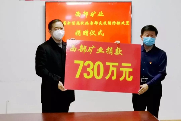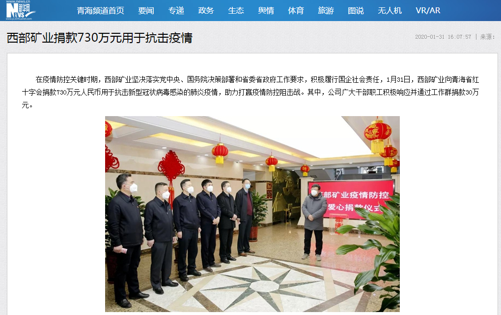 在疫情防控关键时期,西部矿业坚决落实党中央、国务院决策部署和省委省政府工作要求,积极履行国企社会责任,1月31日,西部矿业向青海省红十字会捐款730万元人民币用于抗击新型冠状病毒感染的肺炎疫情,助力打赢疫情防控阻击战。其中,公司广大干部职工积极响应并通过工作群捐款30万元。