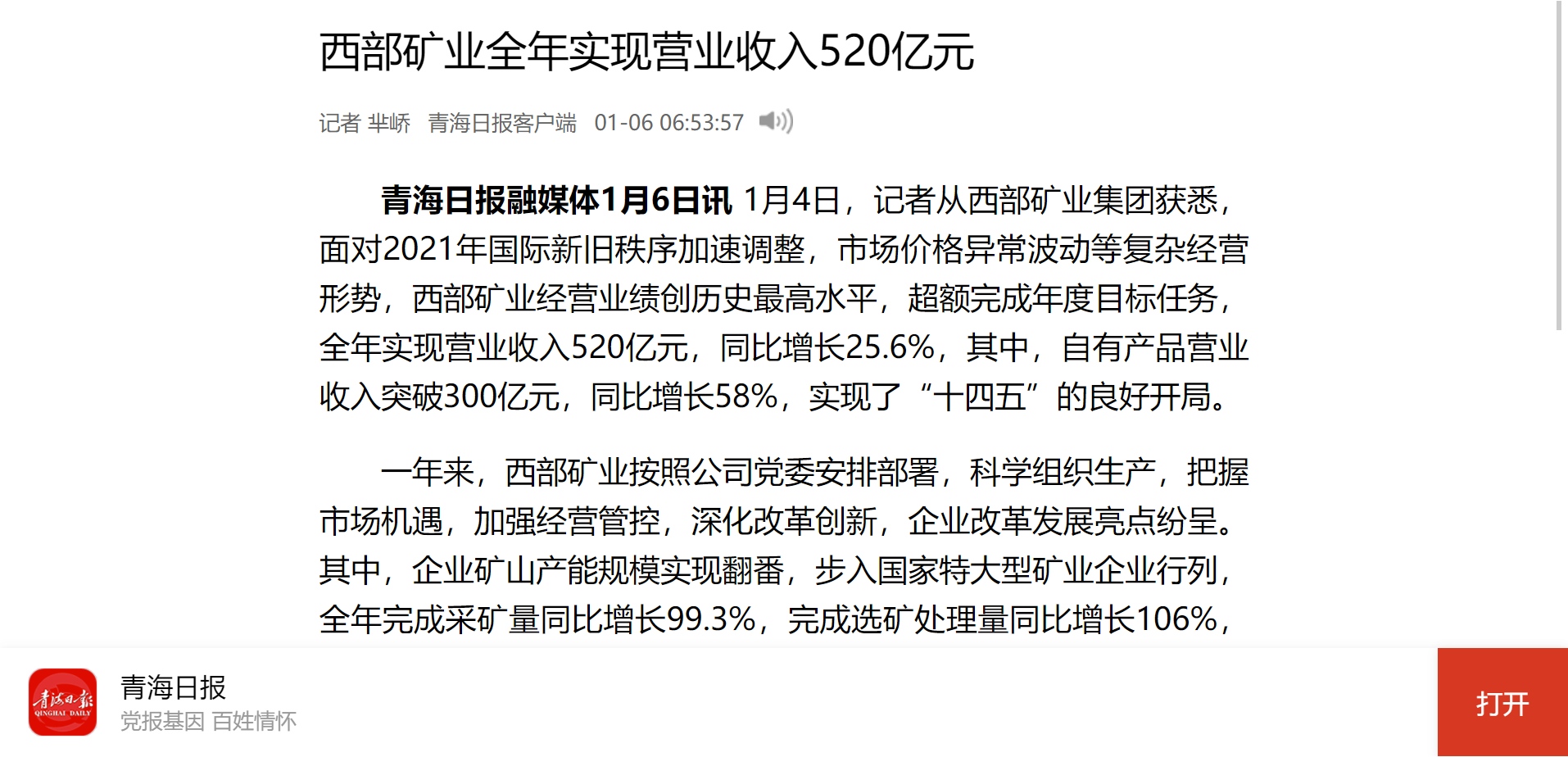 1月4日,记者从西部矿业集团获悉,面对2021年国际新旧秩序加速调整,市场价格异常波动等复杂经营形势,西部矿业经营业绩创历史最高水平,超额完成年度目标任务,全年实现营业收入520亿元,同比增长25.6%,其中,自有产品营业收入突破300亿元,同比增长58%,实现了“十四五”的良好开局。