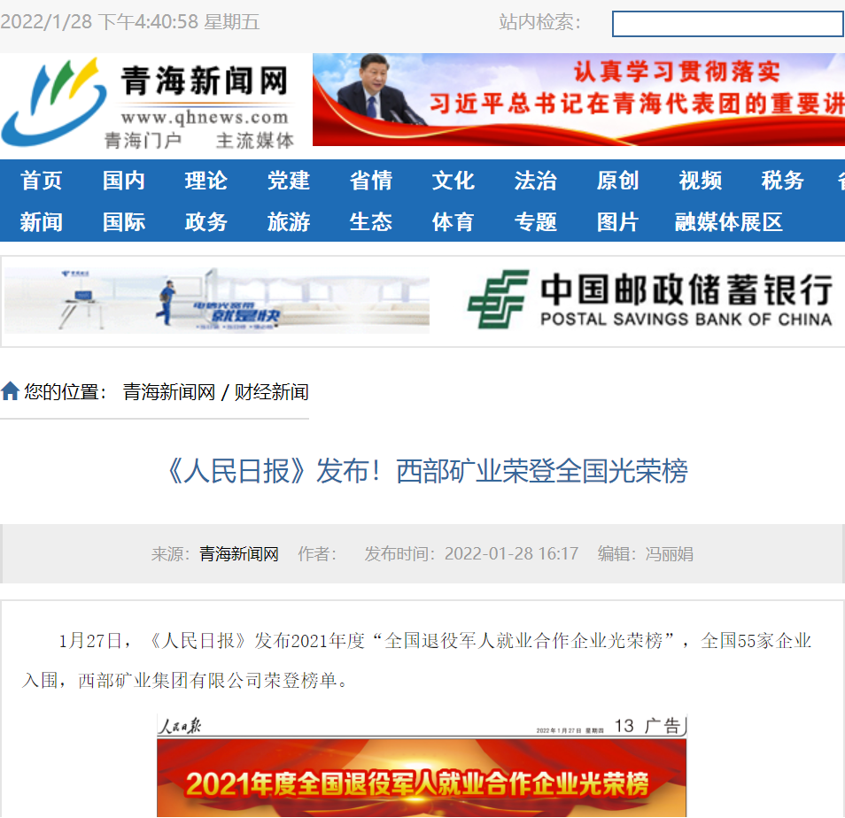 1月27日,《人民日报》发布2021年度“全国退役军人就业合作企业光荣榜”,全国55家企业入围,西部矿业集团有限公司荣登榜单。
