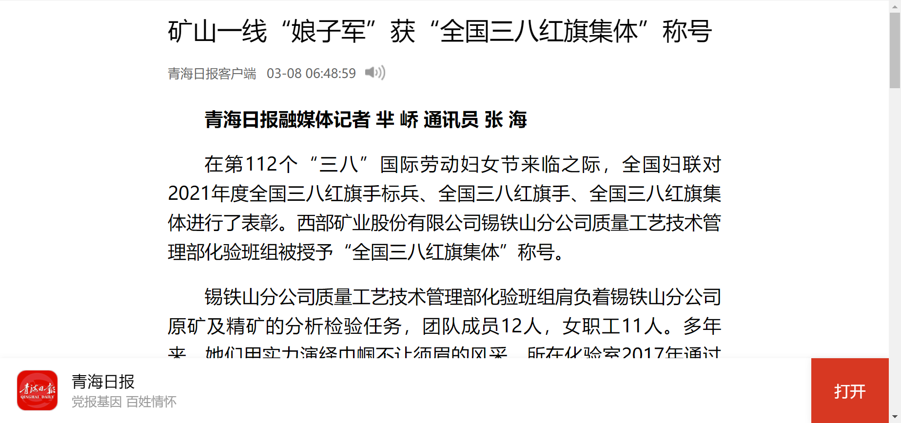 青海日报融媒体记者 芈 峤 通讯员 张 海 在第112个“三八”国际劳动妇女节来临之际,全国妇联对2021年度全国三八红旗手标兵、全国三八红旗手、全国三八红旗集体进行了表彰。西部矿业股份有限公司锡铁山分公司质量工艺技术管理部化验班组被授予“全国三八红旗集体”称号。