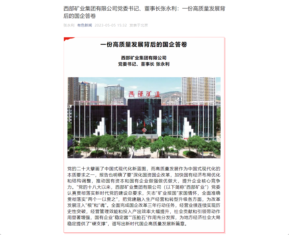 党的二十大擘画了中国式现代化新蓝图,而高质量发展作为中国式现代化的本质要求之一,报告也明确了要“深化国资国企改革,加快国有经济布局优化和结构调整,推动国有资本和国有企业做强做优做大,提升企业核心竞争力。”党的十八大以来,西部矿业集团有限公司(以下简称“西部矿业”)党委认真贯彻落实新时代党的建设总要求,矢志“矿业报国”家国情怀,全面准确贯彻落实“两个一以贯之”,把党建融入生产经营和转型升级各方面,为改革发展注入“根”和“魂”。全面完成国企改革三年行动任务,经营业绩连续实现历史性突破,经营管理效能和投入产出效率大幅提升,社会贡献和引领带动作用显著增强,国有企业“稳定器”“压舱石”作用充分发挥,为地方经济社会大局稳定提供了“硬支撑”,谱写出新时代国企高质量发展新篇章。
