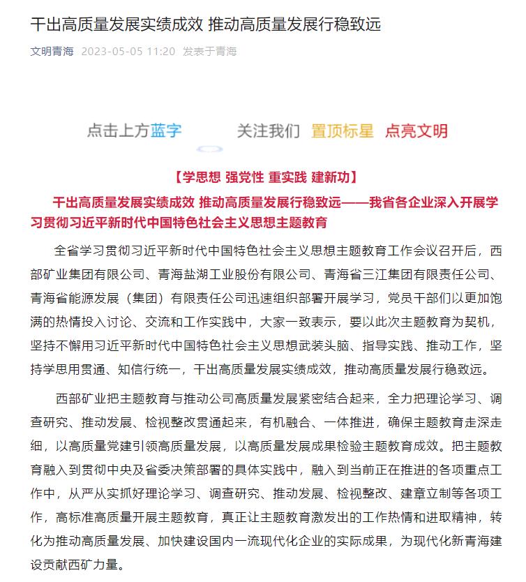 西部矿业把主题教育与推动公司高质量发展紧密结合起来,全力把理论学习、调查研究、推动发展、检视整改贯通起来,有机融合、一体推进,确保主题教育走深走细,以高质量党建引领高质量发展,以高质量发展成果检验主题教育成效。把主题教育融入到贯彻中央及省委决策部署的具体实践中,融入到当前正在推进的各项重点工作中,从严从实抓好理论学习、调查研究、推动发展、检视整改、建章立制等各项工作,高标准高质量开展主题教育,真正让主题教育激发出的工作热情和进取精神,转化为推动高质量发展、加快建设国内一流现代化企业的实际成果,为现代化新青海建设贡献西矿力量。