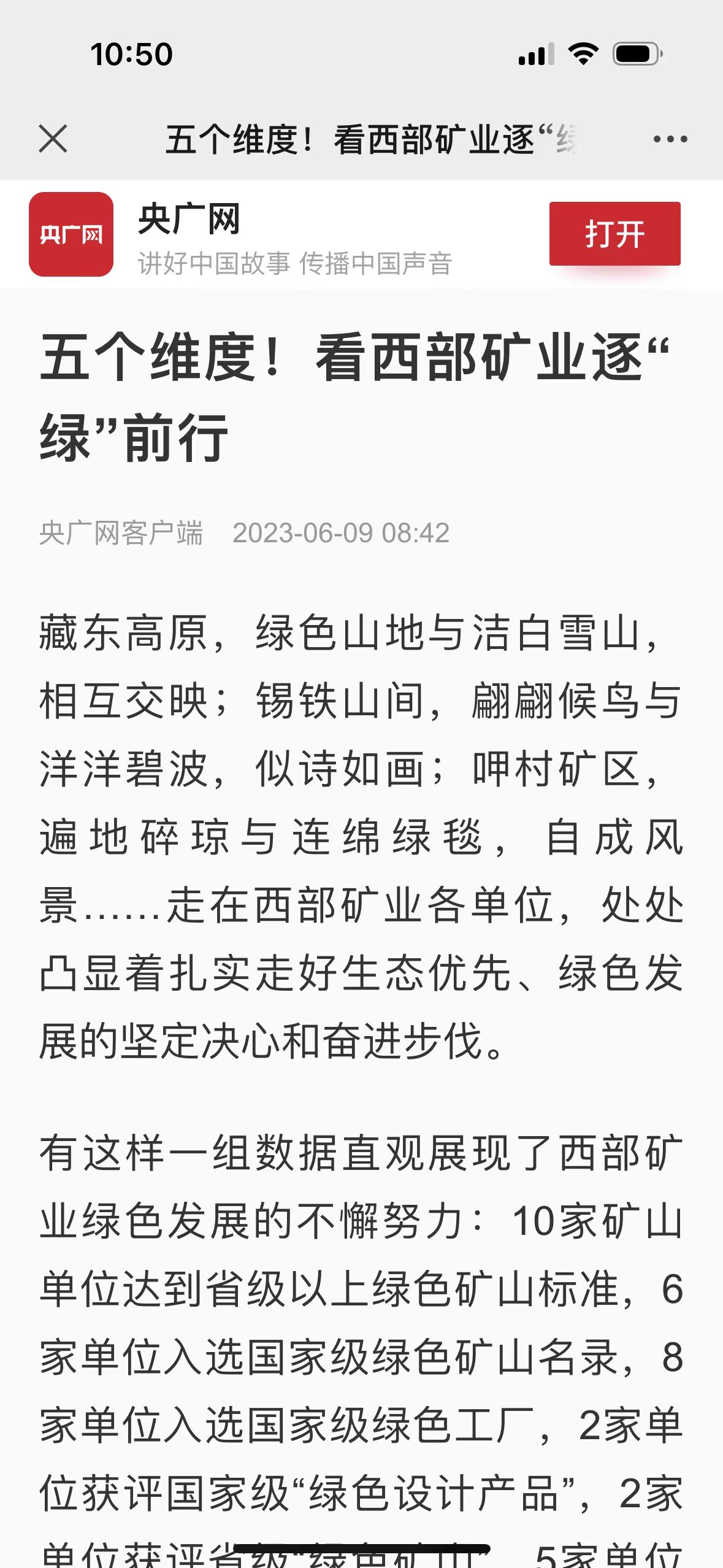 一次次真金白银的生态投入,一个个绿色环保的实在项目,一组组节能降碳的醒目数据,是公司加快推进清洁生产技术改造、培育壮大节能环保和清洁生产产业的高质量答卷。西部矿业将始终完整、准确、全面贯彻新发展理念,积极融入和服务新发展格局,深入贯彻落实党的二十大精神,坚定不移推动生态文明建设,围绕“五个全面提升”,把创建“零碳企业”作为推动绿色发展的重要工作,绿色高效利用矿区土地资源,走智慧化、集约化、高效化创建路子,让绿色始终成为西部矿业高质量发展最靓丽的底色。