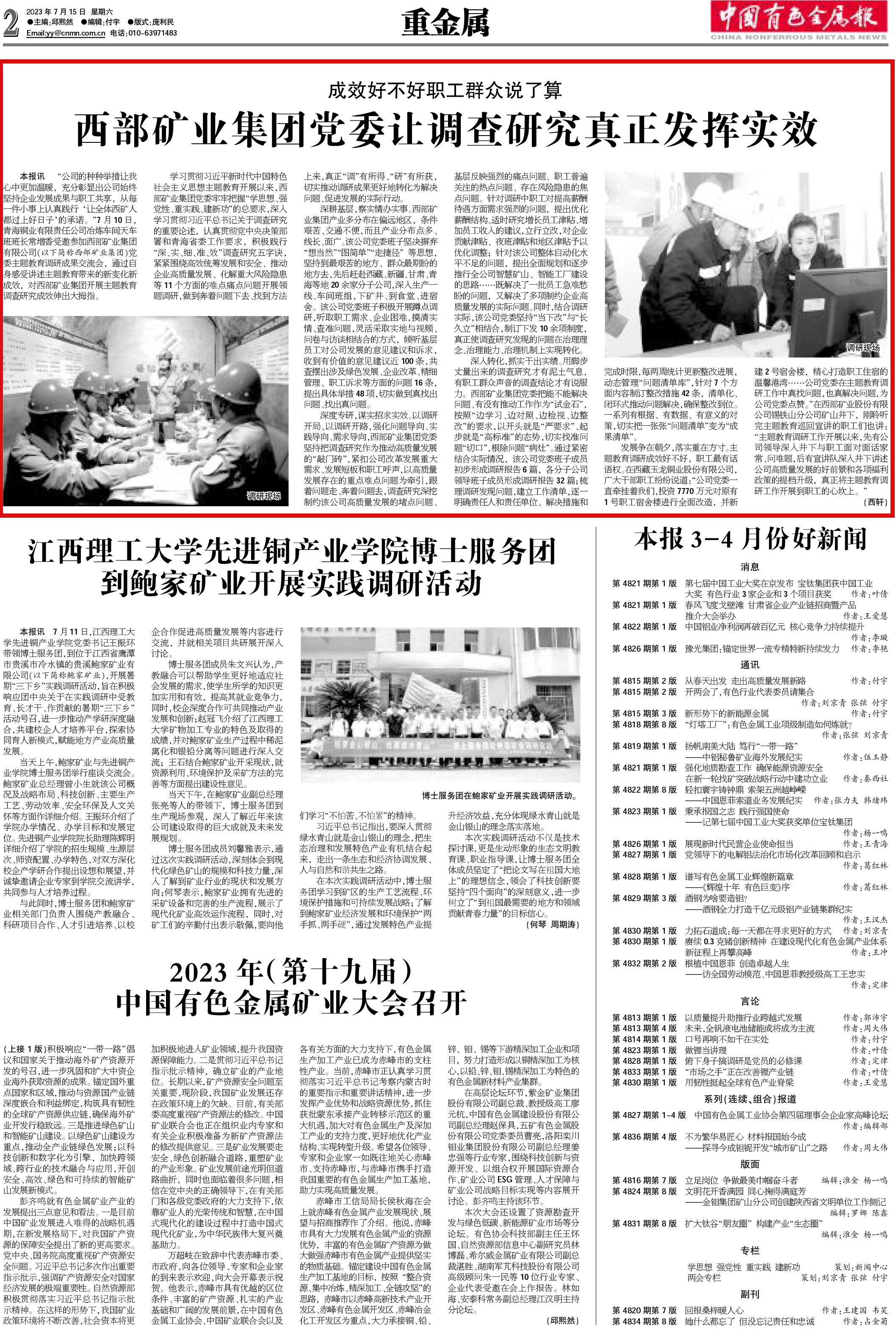 深度专研,谋实招求实效。以调研开局、以调研开路,强化问题导向、实践导向、需求导向,西部矿业集团党委坚持把调查研究作为推动高质量发展的“敲门砖”,紧扣公司改革发展重大需求、发展短板和职工呼声,以高质量发展存在的重点难点问题为牵引,跟着问题走、奔着问题去,调查研究深挖制约该公司高质量发展的堵点问题、基层反映强烈的痛点问题、职工普遍关注的热点问题、存在风险隐患的焦点问题。针对调研中职工对提高薪酬待遇方面需求强烈的问题,提出优化薪酬结构、适时研究增长员工津贴、增加员工收入的建议,立行立改,对企业贡献津贴、夜班津贴和地区津贴予以优化调整;针对该公司整体自动化水平不足的问题,提出全面规划和逐步推行全公司智慧矿山、智能工厂建设的思路……既解决了一批员工急难愁盼的问题,又解决了多项制约企业高质量发展的实际问题。同时,结合调研实际,该公司党委坚持“当下改”与“长久立”相结合,制订下发10余项制度,真正使调查研究发现的问题在治理理念、治理能力、治理机制上实现转化。