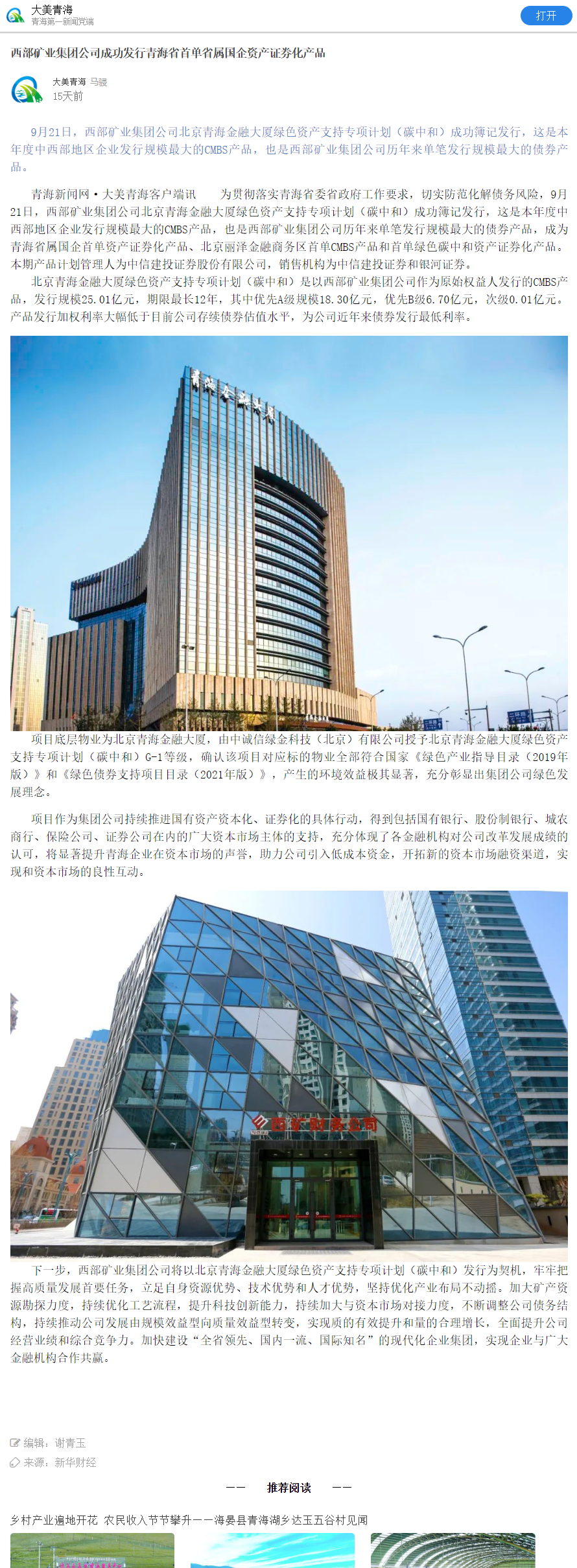 9月21日,西部矿业集团公司北京青海金融大厦绿色资产支持专项计划(碳中和)成功簿记发行,这是本年度中西部地区企业发行规模最大的CMBS产品,也是西部矿业集团公司历年来单笔发行规模最大的债券产品。