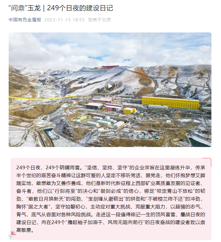 249个日夜,249个阴晴雨雪。“坚信、坚持、坚守”的企业宗旨在这里凝练升华,传承半个世纪的艰苦奋斗精神让这群可爱的人坚定不移听党话、跟党走,他们怀抱梦想又脚踏实地,敢想敢为又善作善成,他们是新时代新征程上西部矿业高质量发展的见证者、奋斗者,他们以“行则将至”的决心和“做则必成”的信心,铆足“咬定青山不放松”的韧劲、“敢教日月换新天”的闯劲、“宝剑锋从磨砺出”的拼劲和“不破楼兰终不还”的冲劲,胸怀“国之大者”,坚守如磐初心,主动应对重大挑战、克服重大阻力,以超强的志气、骨气、底气从容面对各种风险挑战。走进这一段值得铭记一生的顶风冒雪、鏖战日夜的建设日记,向在249个“撸起袖子加油干、风雨无阻向前行”的日夜奋战的建设者致以崇高敬意。