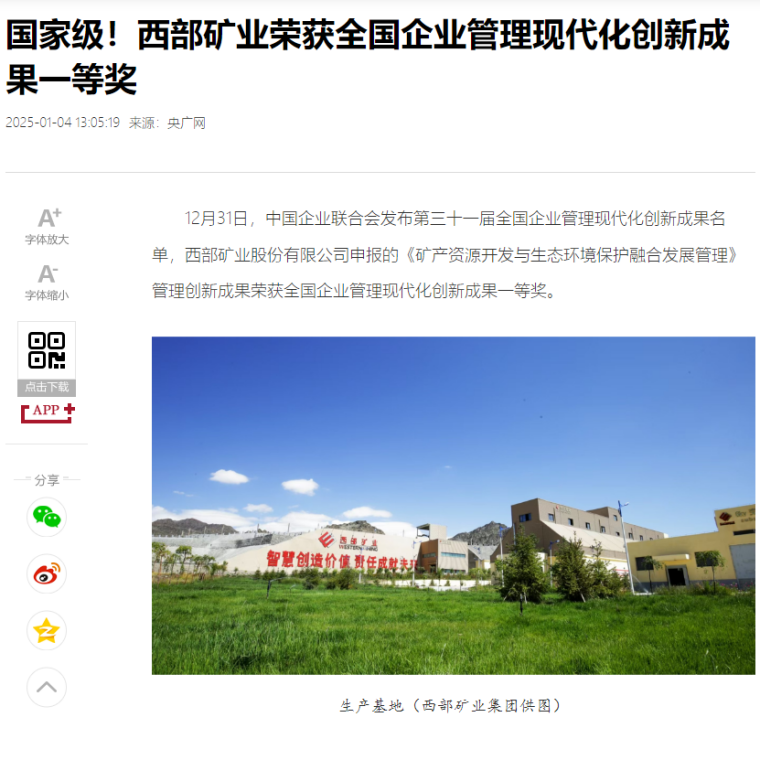 12月31日,中国企业联合会发布第三十一届全国企业管理现代化创新成果名单,西部矿业股份有限公司申报的《矿产资源开发与生态环境保护融合发展管理》管理创新成果荣获全国企业管理现代化创新成果一等奖。