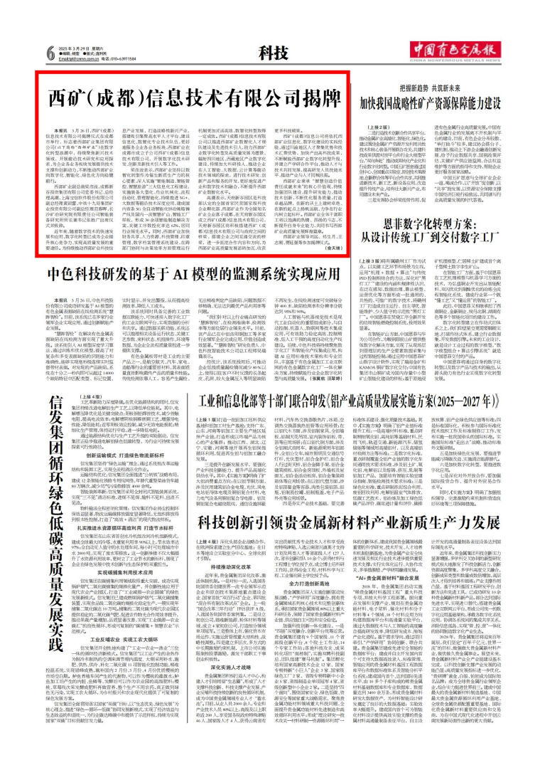 3月26日,西矿(成都)信息技术有限公司揭牌仪式在成都市举行,标志着西部矿业集团有限公司(以下简称“西部矿业”)在数字化转型浪潮中,持续聚焦新兴技术领域,开展前沿技术研究和应用探索,为企业各业务板块发展提供技术支撑和创新动力,不断推动西部矿业向数字化、智能化、绿色化方向稳健前行。