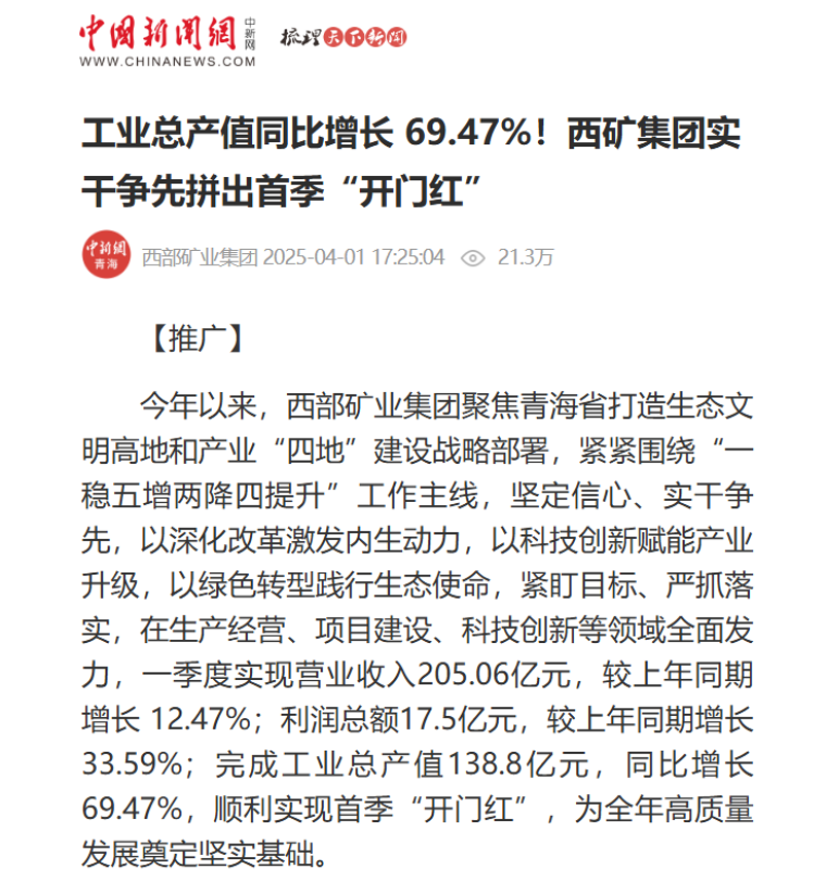 今年以来,西部矿业集团聚焦青海省打造生态文明高地和产业“四地”建设战略部署,紧紧围绕“一稳五增两降四提升”工作主线,坚定信心、实干争先,以深化改革激发内生动力,以科技创新赋能产业升级,以绿色转型践行生态使命,紧盯目标、严抓落实,在生产经营、项目建设、科技创新等领域全面发力,一季度实现营业收入205.06亿元,较上年同期增长 12.47%;利润总额17.5亿元,较上年同期增长33.59%;完成工业总产值138.8亿元,同比增长 69.47%,顺利实现首季“开门红”,为全年高质量发展奠定坚实基础。
