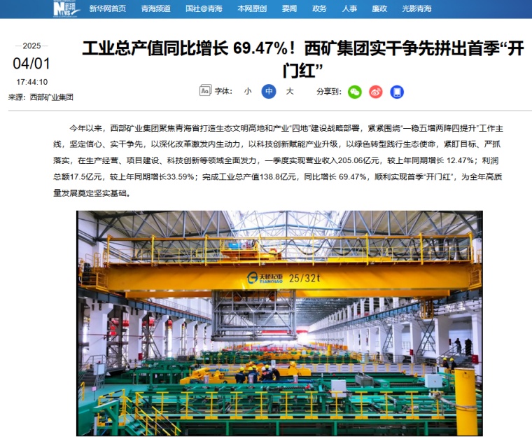 今年以来,西部矿业集团聚焦青海省打造生态文明高地和产业“四地”建设战略部署,紧紧围绕“一稳五增两降四提升”工作主线,坚定信心、实干争先,以深化改革激发内生动力,以科技创新赋能产业升级,以绿色转型践行生态使命,紧盯目标、严抓落实,在生产经营、项目建设、科技创新等领域全面发力,一季度实现营业收入205.06亿元,较上年同期增长 12.47%;利润总额17.5亿元,较上年同期增长33.59%;完成工业总产值138.8亿元,同比增长 69.47%,顺利实现首季“开门红”,为全年高质量发展奠定坚实基础。