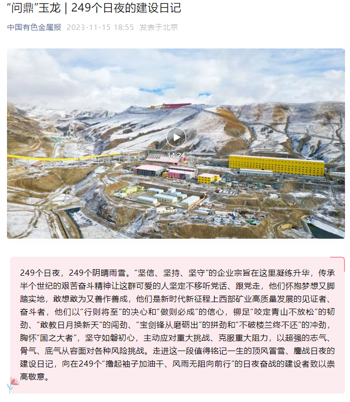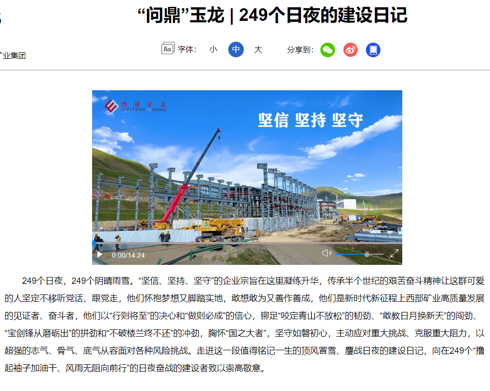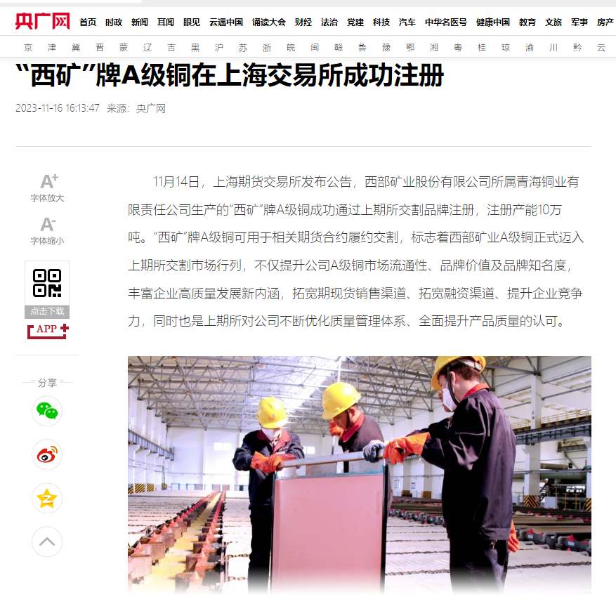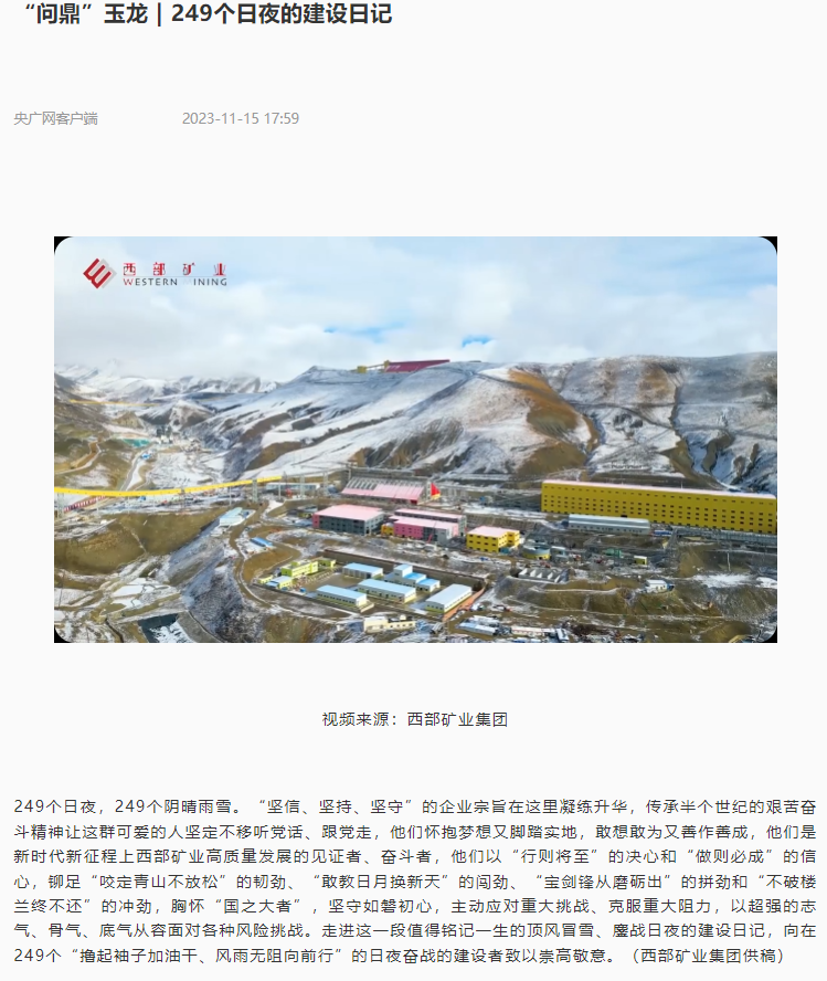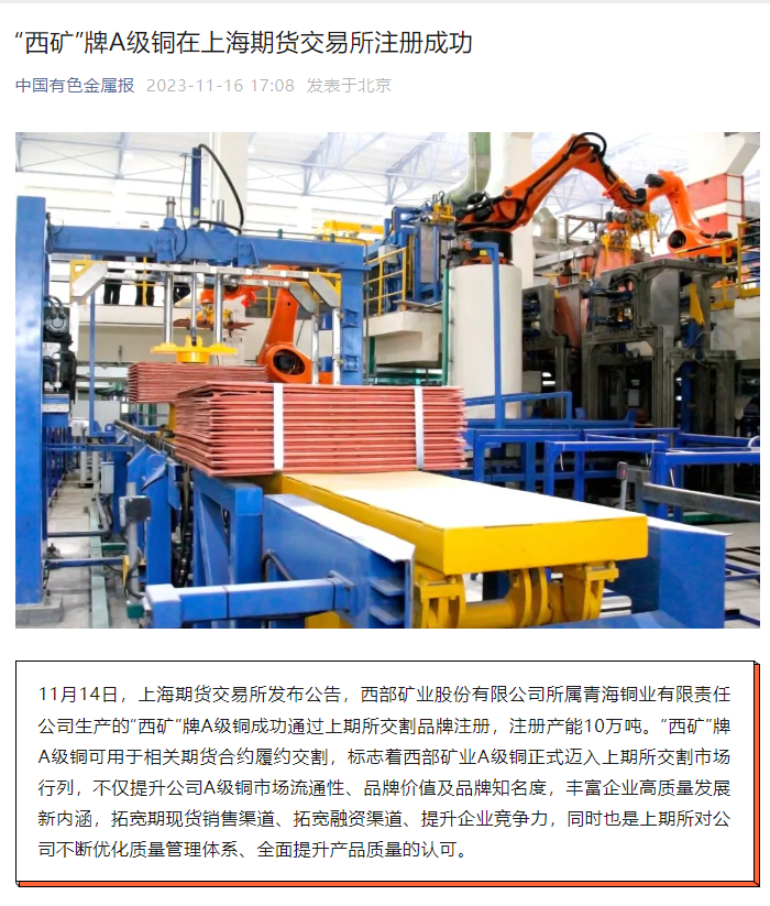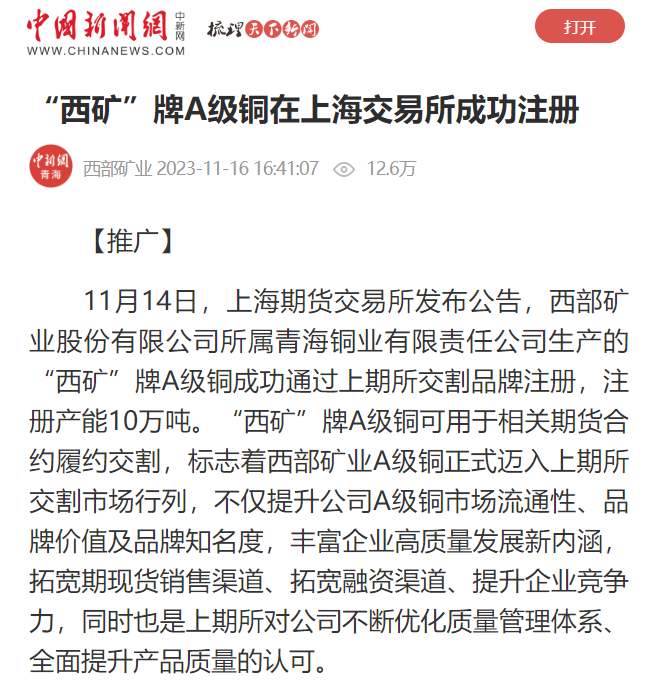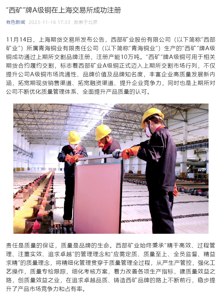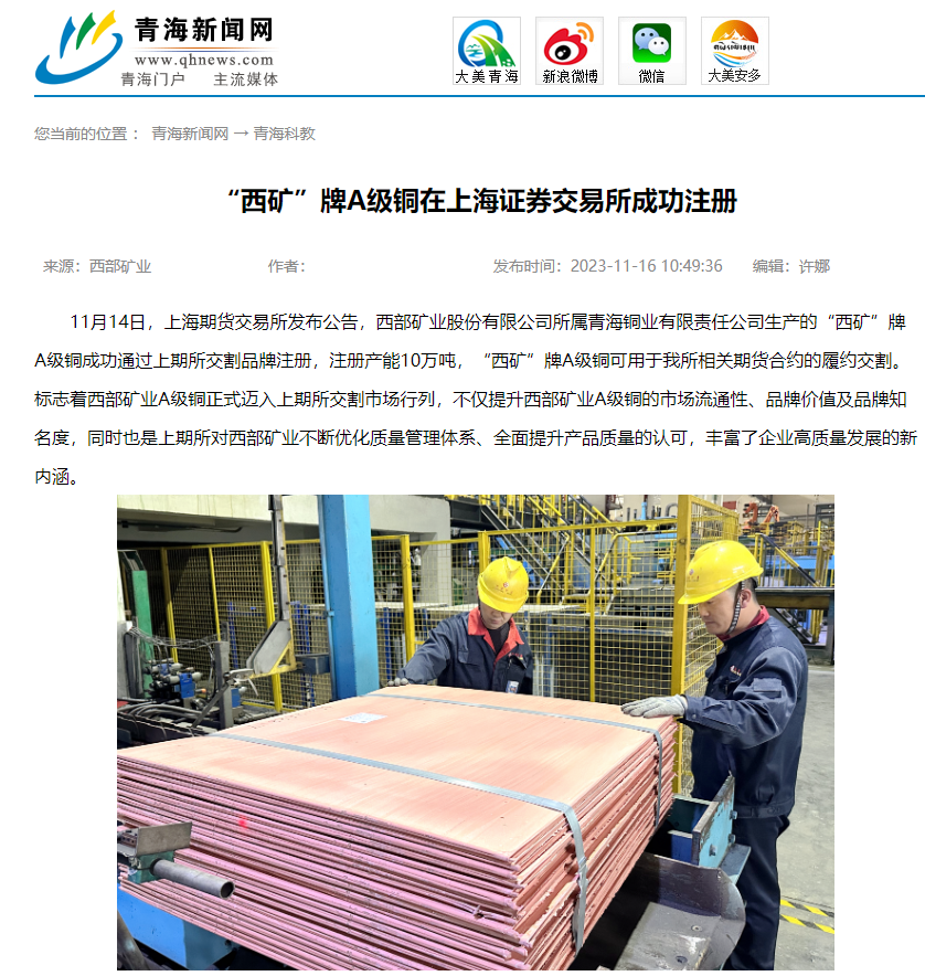 连日来,央广网、新华网青海频道、中新网青海频道、青海日报、青海新闻网、中国有色金属报、中国有色金属杂志微信平台、中国矿业报等多家媒体,聚焦公司改革发展步伐、高品质产品管理、品牌竞争优势成果成效纷纷报道,取得较好反响,有效提升了西部矿业外部形象和品牌影响力。