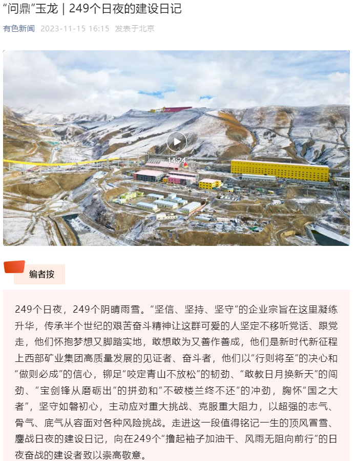 一直以来,西部矿业集团始终坚持以习近平新时代中国特色社会主义思想为指引,按照省委省政府部署要求,坚持稳字当头、稳中求进工作总基调,以一往无前的奋斗姿态和击楫勇进的实干作为,在追求高质量发展的道路上奋勇前行,以实际成效争当高质量发展“排头兵”,留下脚踏实地的足迹。玉龙铜业矿山改扩建项目建成投产,再次刷新藏东高原项目建设的“西矿速度”;青海铜业A级铜成功在上海交易所注册,打响了A级铜市场品牌……