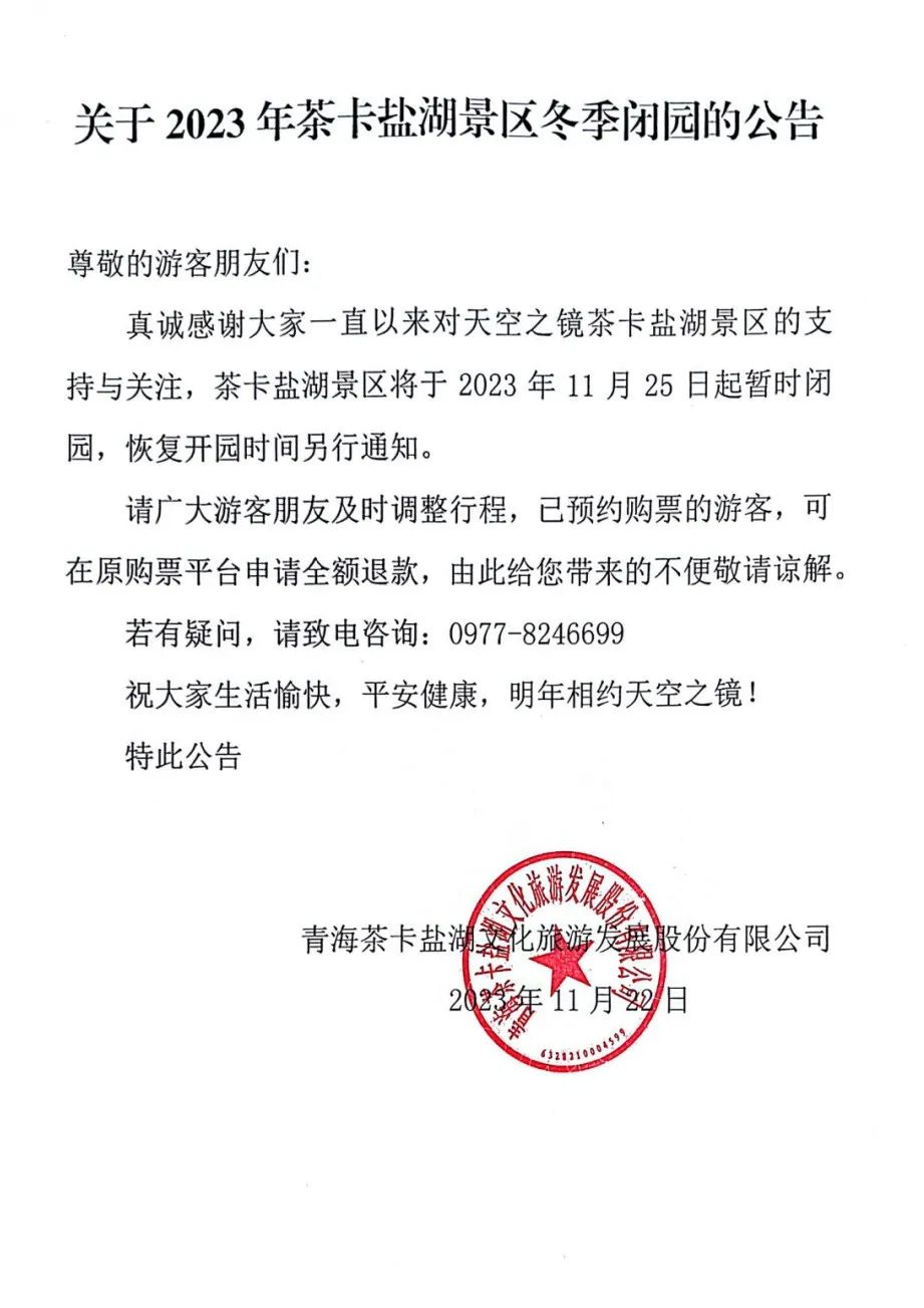 关于2023年茶卡盐湖景区冬季闭园的公告