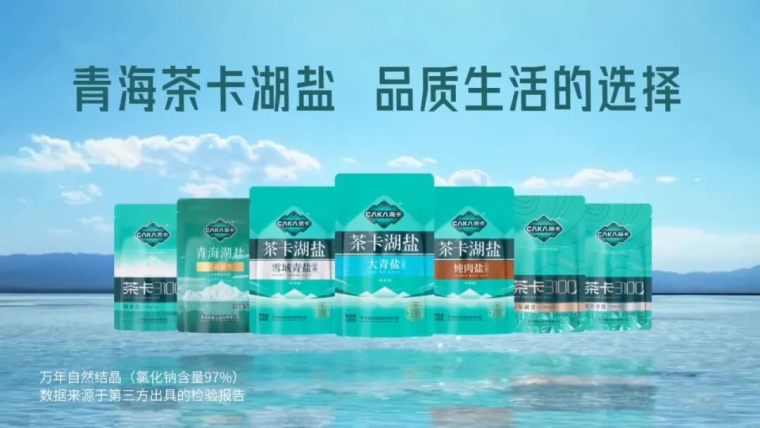面对盐业市场的激烈竞争,青海盐业以创新思维活化企业文化表达,推动文化从“内在精神”转化为“可见可感的品牌价值”。在品牌建设上,打造系统化视觉符号体系,以茶卡盐湖的青色与白色为基调,象征着天空与盐晶的纯净融合,品牌LOGO标明“CAKA茶卡”字样,简洁明了地传递出品牌的来源和核心优势,形成了清晰的视觉锚点,包装采用开窗式结构,露出天然盐晶形态,印刻盐湖景观图案,让产品成为流动的文化载体。