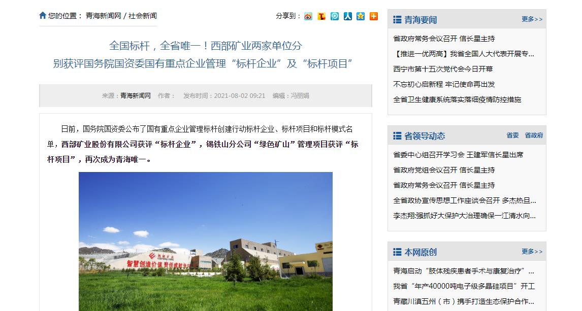 日前,国务院国资委公布了国有重点企业管理标杆创建行动标杆企业、标杆项目和标杆模式名单,西部矿业股份有限公司获评“标杆企业”,锡铁山分公司“绿色矿山”管理项目获评“标杆项目”,再次成为青海唯一。