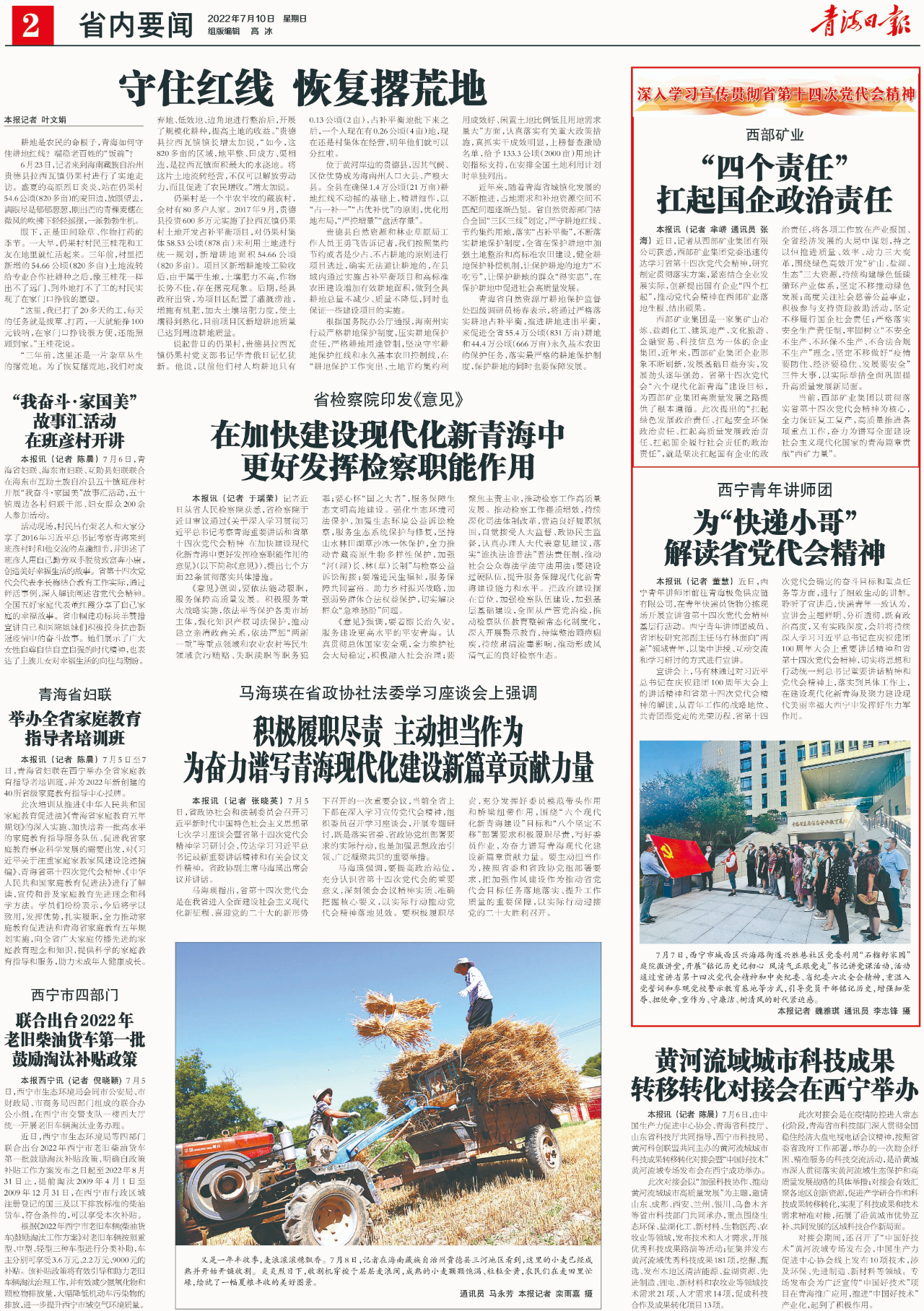 火红七月,西部矿业集团公司生产经营“热气腾腾”,连续17年稳居青海企业50强榜首;上半年时间任务“双过半”,经营成果创历史最好水平。短短几天,西部矿业集团连晒两份成绩单,这是公司深入贯彻落实省第十四次党代会精神,不断推动高质量发展的结果。7月11日,《青海新闻联播》《青海日报》分别以“西部矿业:盯重点 谋全局 跑出经济发展‘加速度’”“‘四个责任’扛起国企政治责任”为题深入报道公司不断巩固提升高质量发展新局面,推动省第十四次党代会精神在西部矿业落地生根、结出硕果务实举措。