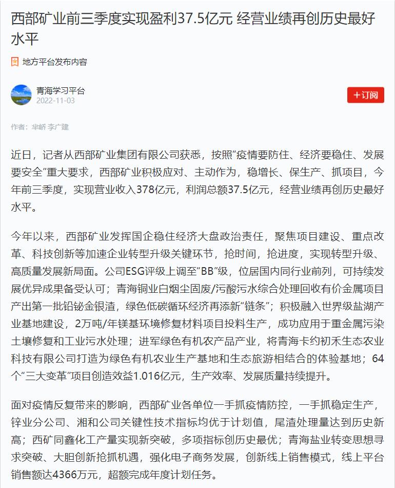 今年以来,西部矿业发挥国企稳住经济大盘政治责任,聚焦项目建设、重点改革、科技创新等加速企业转型升级关键环节,抢时间,抢进度,实现转型升级、高质量发展新局面。公司ESG评级上调至“BB”级,位居国内同行业前列,可持续发展优异成果备受认可;青海铜业白烟尘固废/污酸污水综合处理回收有价金属项目产出第一批铅铋金银渣,绿色低碳循环经济再添新“链条”;积极融入世界级盐湖产业基地建设,2万吨/年镁基环境修复材料项目投料生产,成功应用于重金属污染土壤修复和工业污水处理;进军绿色有机农产品产业,将青海卡约初禾生态农业科技有限公司打造为绿色有机农业生产基地和生态旅游相结合的体验基地;64个“三大变革”项目创造效益1.016亿元,生产效率、发展质量持续提升。