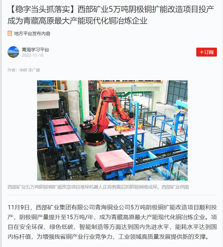 11月9日,西部矿业集团有限公司青海铜业公司5万吨阴极铜扩能改造项目顺利投产,阴极铜产量提升至15万吨/年,成为青藏高原最大产能现代化铜冶炼企业。项目在安全环保、绿色低碳、智能制造等方面达到国内先进水平,能耗水平达到国内标杆值,为增强我省铜产业行业竞争力、工业领域高质量发展提供新的支撑。