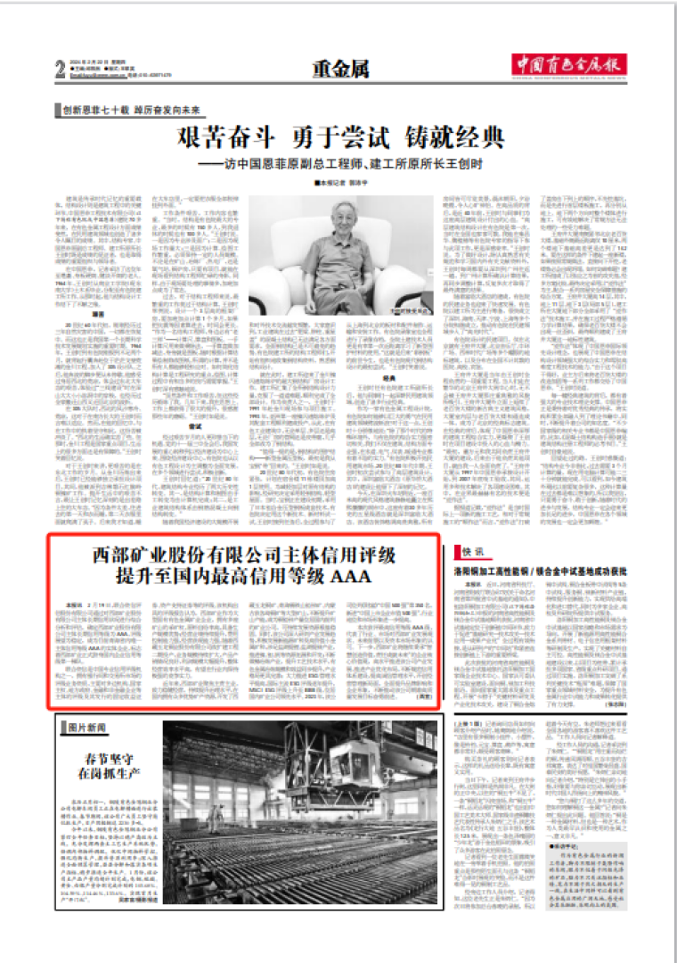【中国有色金属报】西部矿业股份有限公司主体信用评级提升至国内最高信用等级AAA