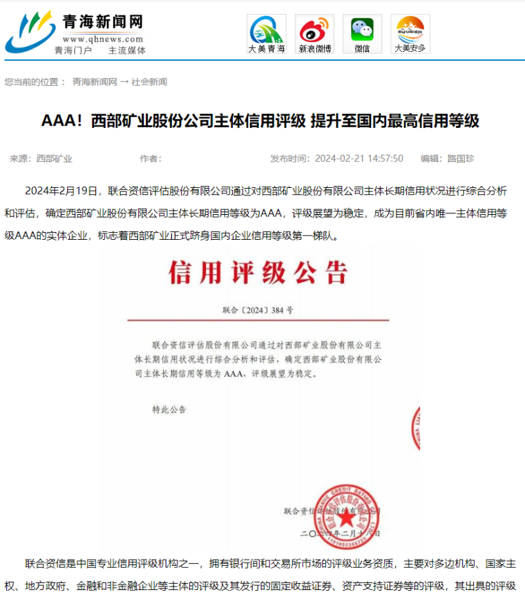 【青海新闻网】AAA!西部矿业股份有限公司主体信用评级提升至国内最高信用等级