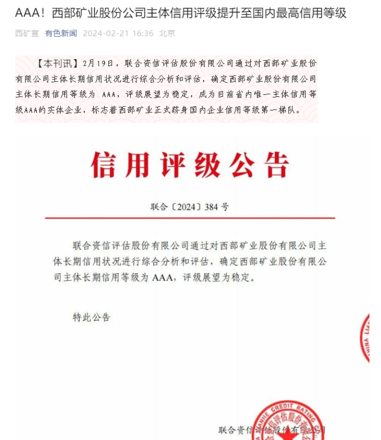 2024年2月19日,联合资信评估股份有限公司通过对西部矿业股份有限公司主体长期信用状况进行综合分析和评估,确定西部矿业股份有限公司主体长期信用等级为 AAA,评级展望为稳定,成为目前省内唯一主体信用等级AAA的实体企业,标志着西部矿业正式跻身国内企业信用等级第一梯队。