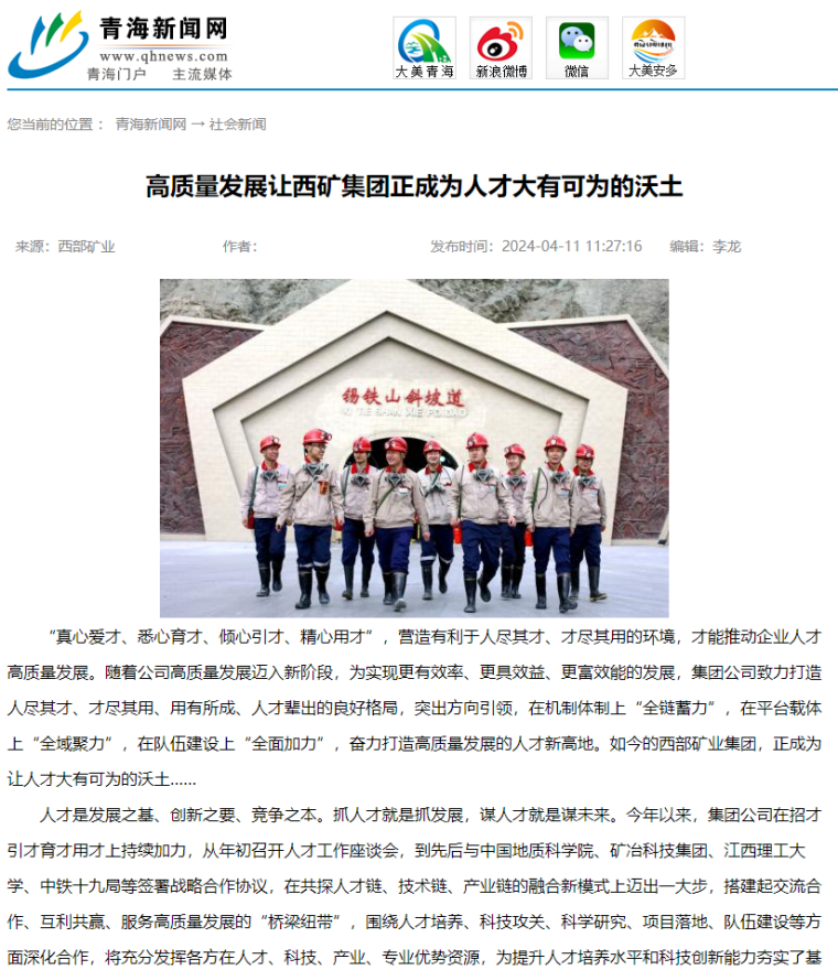 “真心爱才、悉心育才、倾心引才、精心用才”,营造有利于人尽其才、才尽其用的环境,才能推动企业人才高质量发展。随着公司高质量发展迈入新阶段,为实现更有效率、更具效益、更富效能的发展,集团公司致力打造人尽其才、才尽其用、用有所成、人才辈出的良好格局,突出方向引领,在机制体制上“全链蓄力”,在平台载体上“全域聚力”,在队伍建设上“全面加力”,奋力打造高质量发展的人才新高地。如今的西部矿业集团,正成为让人才大有可为的沃土……