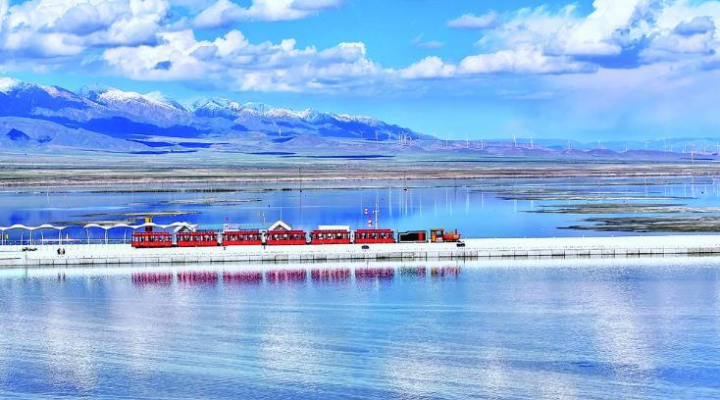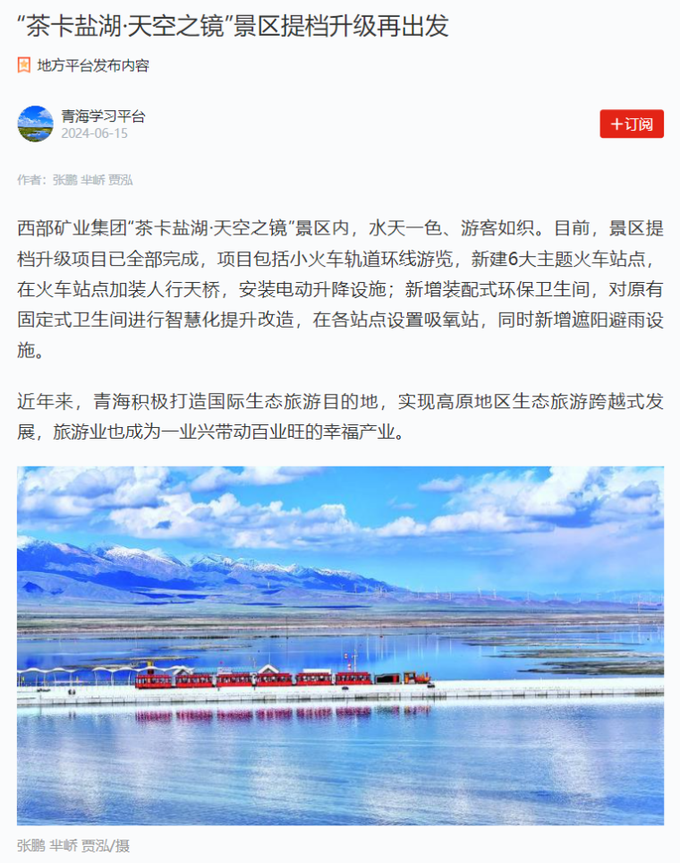 6月11日,西部矿业集团“茶卡盐湖·天空之镜”景区内,水天一色、游客如织。目前,景区提档升级项目已全部完成,项目包括小火车轨道环线游览,新建6大主题火车站点,在火车站点加装人行天桥,安装电动升降设施;新增装配式环保卫生间,对原有固定式卫生间进行智慧化提升改造,在各站点设置吸氧站,同时新增遮阳避雨设施。