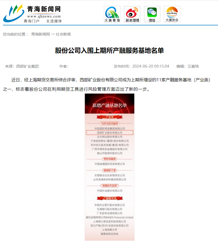 近日,经上海期货交易所综合评审,西部矿业股份有限公司成为上期所增设的11家产融服务基地(产业类)之一,标志着股份公司在利用期货工具进行风险管理方面迈出了新的一步。