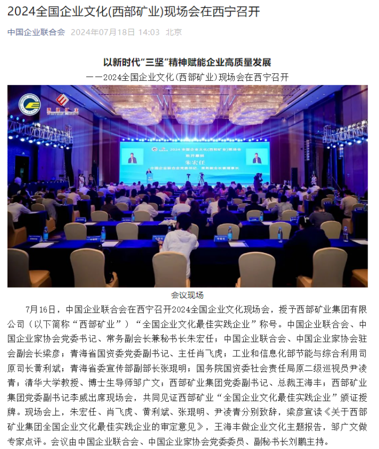 7月16日,中国企业联合会、中国企业家协会在青海西宁召开2024全国企业文化现场会,授予西部矿业“全国企业文化最佳实践企业”称号。中国企业联合会、中国企业家协会党委书记、常务副会长兼理事长朱宏任,中国企业联合会、中国企业家协会驻会副会长梁彦,青海省国资委党委副书记、主任肖飞虎,工业和信息化部节能与综合利用司原司长黄利斌,青海省委宣传部副部长张琨明,国务院国资委社会责任局原二级巡视员尹凌青,清华大学教授、博士生导师邹广文,西部矿业集团党委副书记、总裁王海丰,西部矿业集团党委副书记李威,共同见证西部矿业“全国企业文化最佳实践企业”颁证授牌。