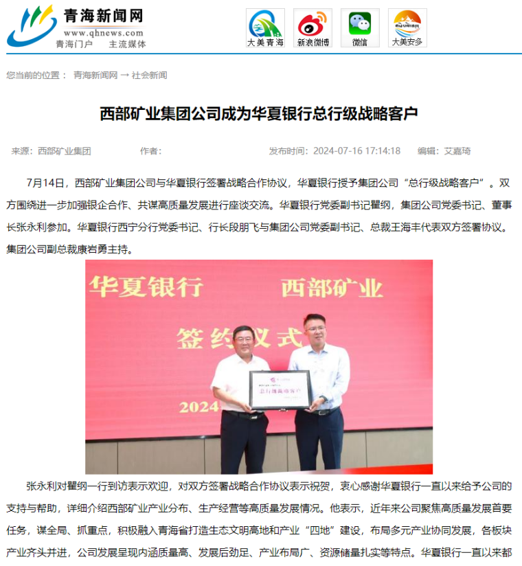 7月14日,集团公司与华夏银行签署战略合作协议,华夏银行授予集团公司“总行级战略客户”。双方围绕进一步加强银企合作、共谋高质量发展进行座谈交流。华夏银行党委副书记瞿纲,集团公司党委书记、董事长张永利参加。华夏银行西宁分行党委书记、行长段朋飞与集团公司党委副书记、总裁王海丰代表双方签署协议。集团公司副总裁康岩勇主持。
