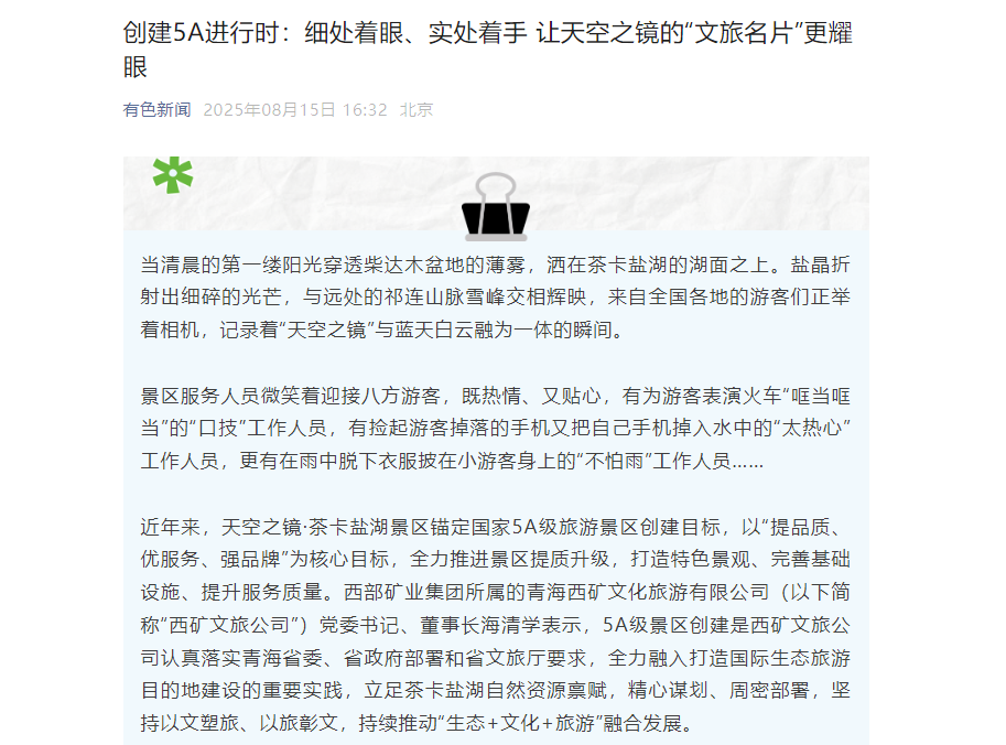 近年来,天空之镜·茶卡盐湖景区锚定国家5A级旅游景区创建目标,以“提品质、优服务、强品牌”为核心目标,全力推进景区提质升级,打造特色景观、完善基础设施、提升服务质量。西部矿业集团所属的青海西矿文化旅游有限公司(以下简称“西矿文旅公司”)党委书记、董事长海清学表示,5A级景区创建是西矿文旅公司认真落实青海省委、省政府部署和省文旅厅要求,全力融入打造国际生态旅游目的地建设的重要实践,立足茶卡盐湖自然资源禀赋,精心谋划、周密部署,坚持以文塑旅、以旅彰文,持续推动“生态+文化+旅游”融合发展。