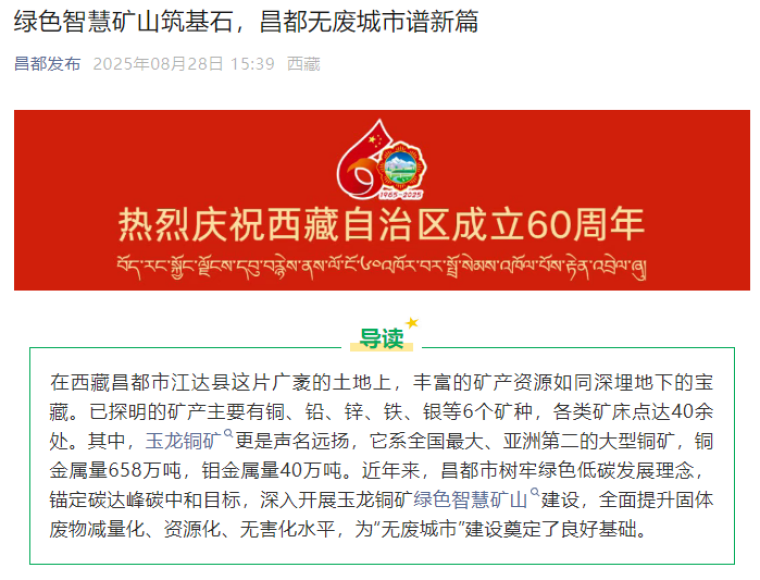 【昌都发布】绿色智慧矿山筑基石,昌都无废城市谱新篇