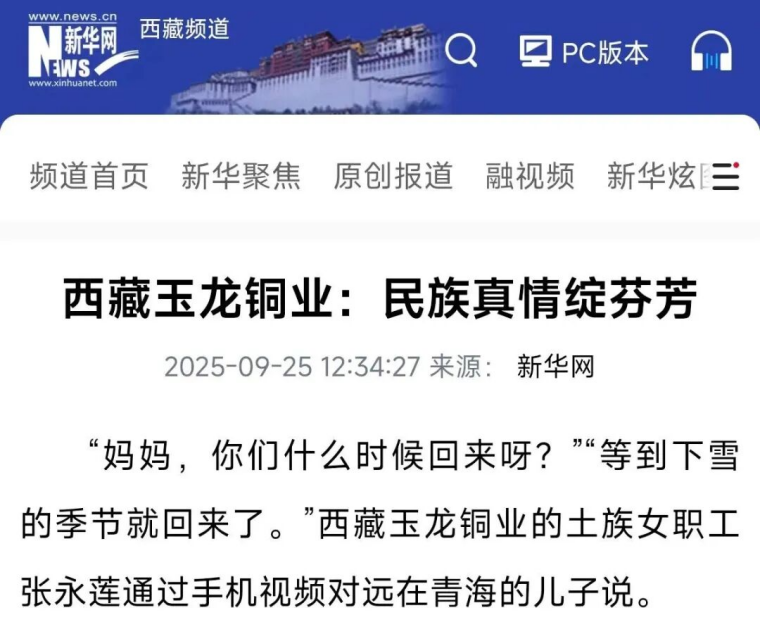 “妈妈,你们什么时候回来呀?”“等到下雪的季节就回来了。”西藏玉龙铜业的土族女职工张永莲通过手机视频对远在青海的儿子说。