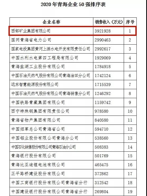 近日,由省工业和信息化厅、省政府国资委、省统计局、省工商联、省企业联合会、省企业家协会共同评审,以2019年企业销售收入(或主营业务收入)为标准,公布“2020年青海企业50强”名单,西部矿业集团有限公司蝉联榜首!