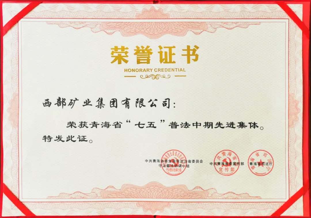 近日,从中共青海省委全面依法治省委员会守法普法协调小组、中共青海省委宣传部、青海省司法厅传来喜讯,西部矿业集团有限公司获全省“七五”普法中期先进集体称号。
