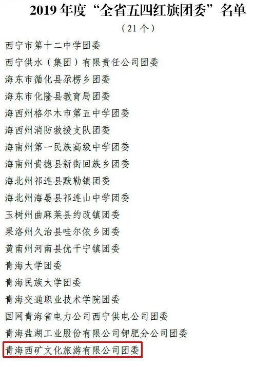 近日,团省委下发《共青团青海省委关于表彰2019年度“全省优秀共青团员”“全省优秀共青团干部(驻村干部)”“全省五四红旗团委”“全省五四红旗团支部(总支)”的决定》,青海西矿文化旅游有限公司团委荣获2019年度“全省五四红旗团委”荣誉称号。