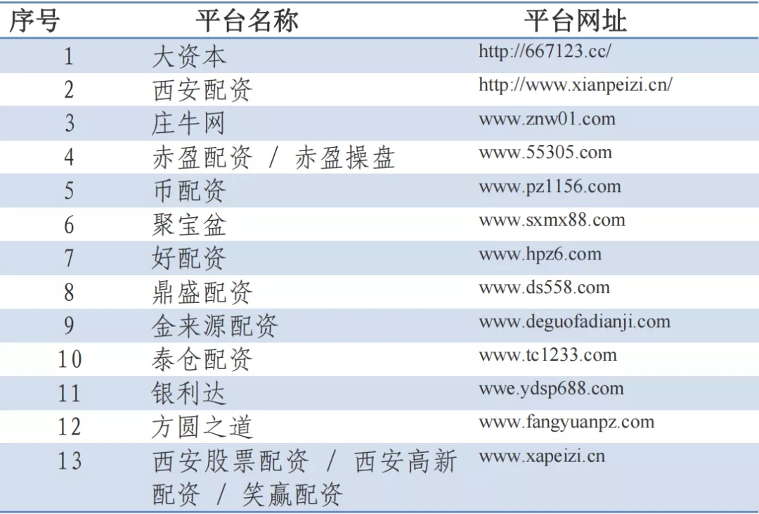 根据相关线索,以下平台(网站、APP)不具有证券期货业务资质,但其平台名称、网站界面包含“股票配资”“期货配资”“融资操盘”“配资炒股”等配资字样,宣传从事场外股票、期货配资活动,请广大员工注意防范风险。