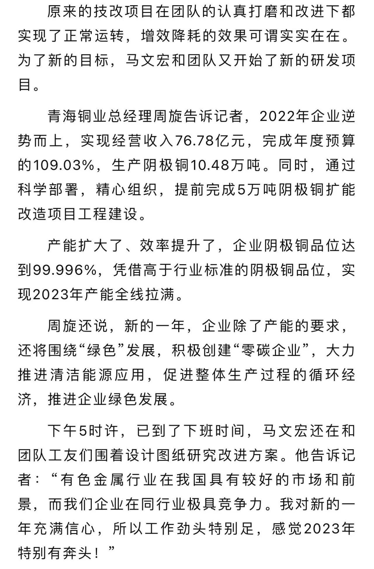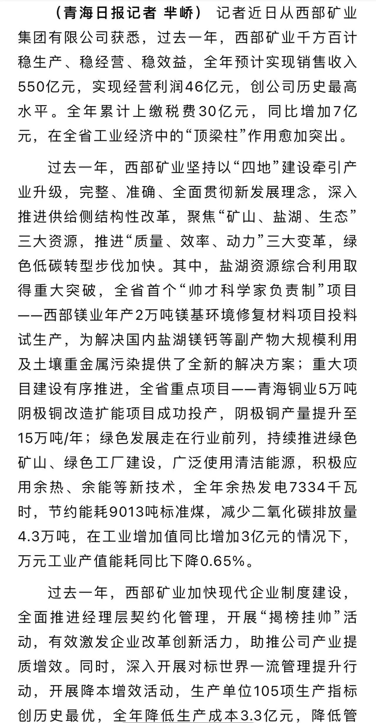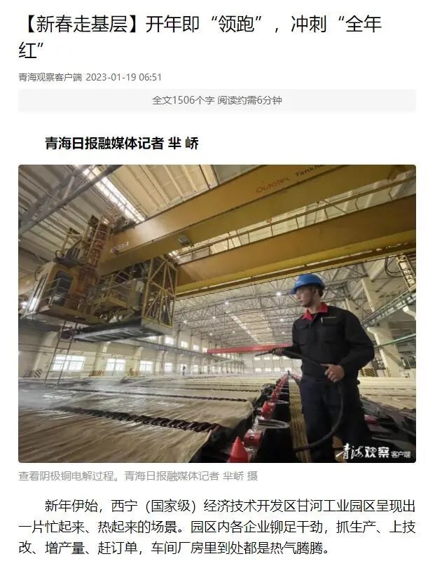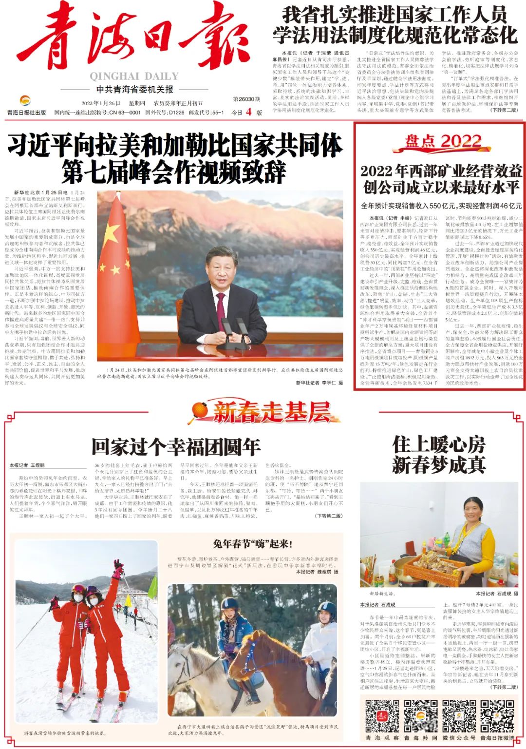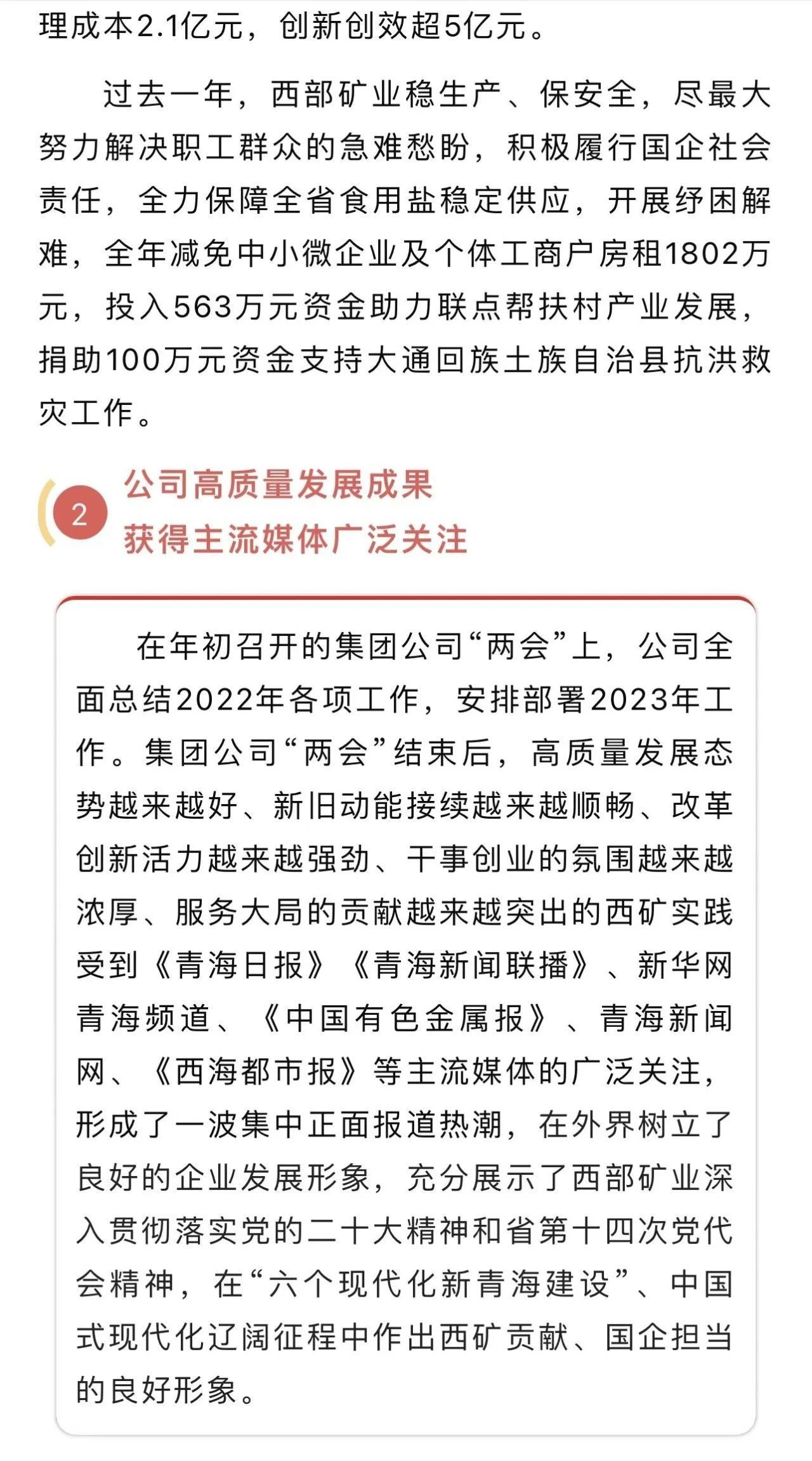 1月26日,《青海日报》头版“盘点2022”栏目以“2022年西部矿业经营效益创公司成立以来最好水平”为题刊发稿件,报道过去一年,公司坚定不移推动“三大变革”,经营业绩再创历史最好水平的具体举措。