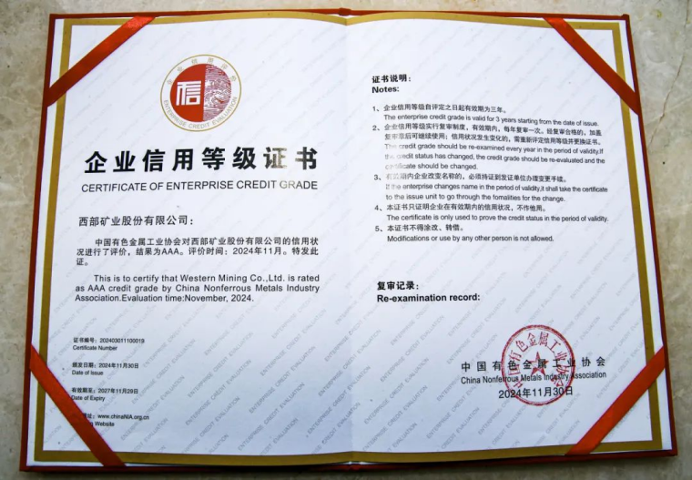近日,中国有色金属工业协会公布2024年度有色金属行业企业信用等级评价结果,西部矿业股份有限公司凭借守法合规、履约诚信、社会责任等方面的优异表现,获评“有色金属行业企业信用等级AAA级单位”。