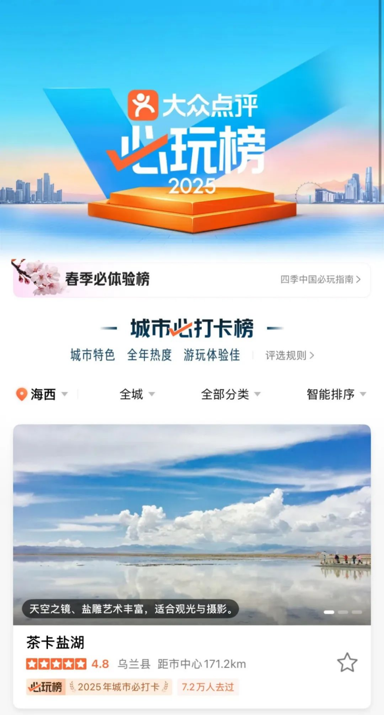 西矿智旅讯(张锦帆) 近日,国民生活消费权威平台大众点评正式发布“2025必玩榜”,青海茶卡盐湖景区凭借持续高涨的用户口碑与消费热度,实力登榜“城市必打卡榜”。这不仅是茶卡盐湖因“天空之镜”爆红以来,十年间从现象级网红景点向品质化旅游标杆的蜕变见证,更是以“生态保护+沉浸体验”的创新模式,为全国文旅行业树立了可持续发展的典范。