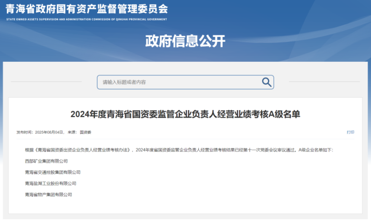 日前,青海省政府国资委下发通知,通报监管企业负责人2024年度经营业绩考核结果,西部矿业集团公司被评定为A级等次。