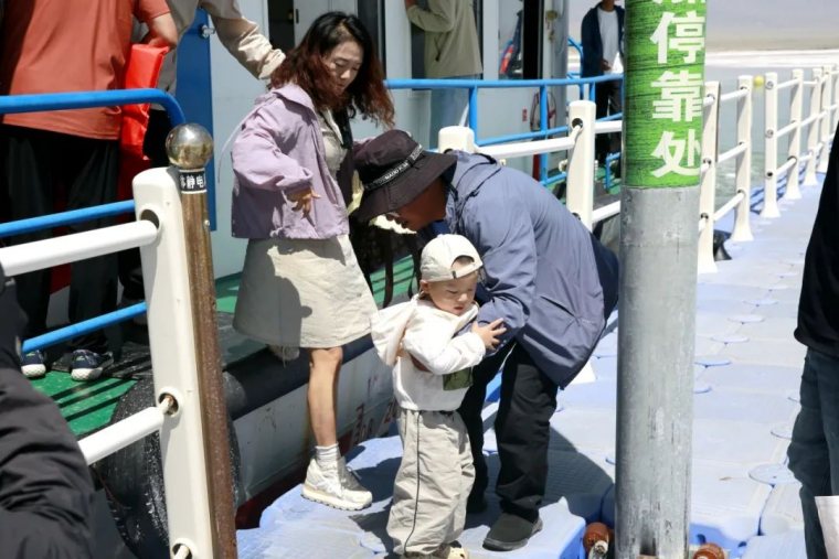 工作人员把小游客抱下游船