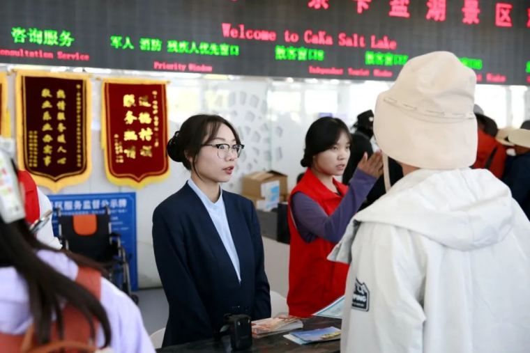 茶卡盐湖景区创新打造“镜映领航”党建品牌,设置4个“党员示范岗”、2个“党员先锋岗”与2个“党员服务台”,30余名党员组成志愿服务队,坚守在停车场、检票口、小火车站台等关键点位,提供游览引导、应急救助、秩序维护、安全疏导等服务,累计服务游客超50万人次。在服务细节上,景区将“微笑服务”“主动服务”理念贯穿全程,落实“三轻四勤五心六声”服务规范,确保游客需求“秒响应”。