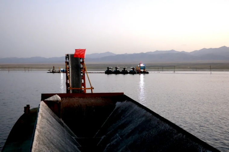 晨雾还未散尽的清晨,抑或是满天星斗的深夜,广袤盐湖响起机器的轰鸣。双刀轮采盐船是一头钢筋铁骨的巨兽,稳稳伏在泛着粼光的卤水之上,刃口划破水面,搅起混着盐晶的浆状盐卤,船身中部的抽吸管道大口吞咽着盐浆,管道内壁上很快凝出薄薄一层白霜,盐浆在舱内经过初步过滤,多余的卤水顺着船舷的导流槽回流湖面,留下的湿盐堆在舱底,渐渐漫出浅淡的盐香。