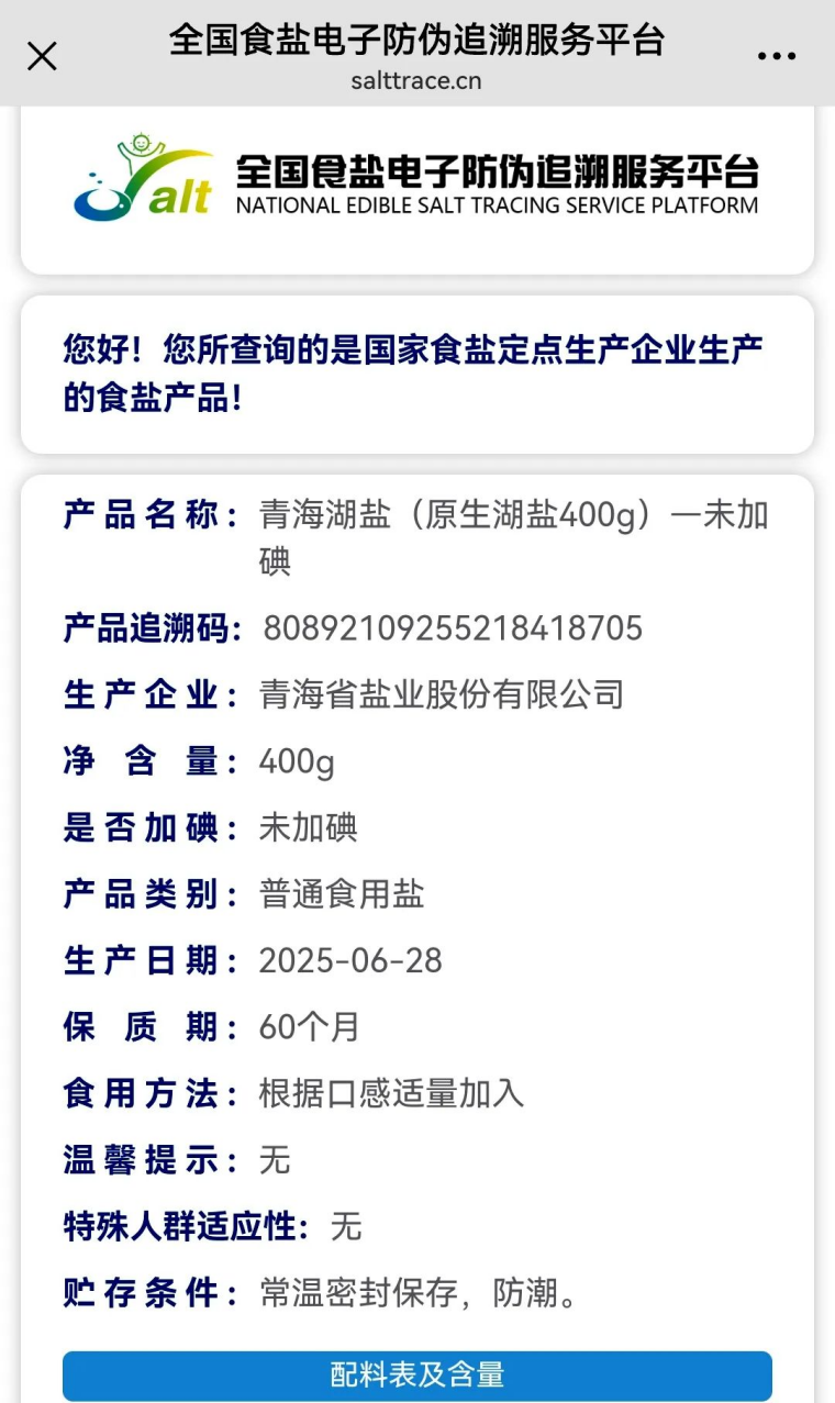 青海盐业茶卡制盐分公司为确保各类盐产品安全与质量,建立了食用盐质量安全电子追溯系统,接入了全国食盐电子防伪追溯服务平台,为每袋盐赋予“数字身份证”,实现从生产到销售的全流程追踪与溯源。