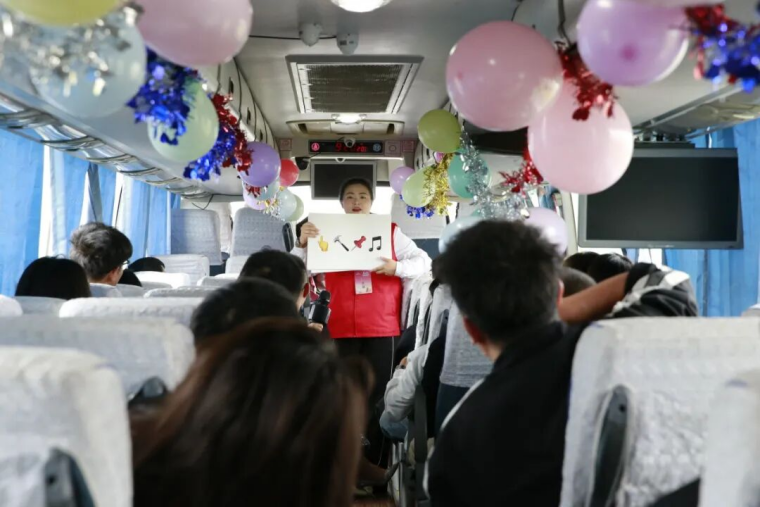 共赴新程,暖意启航,广大青年在笑声盈盈的大巴上破冰。从自我介绍到“击鼓传花”“数字炸弹”等欢快的游戏,现场气氛迅速升温。大家在欢笑与掌声中逐渐放开自己,稍显陌生的面孔也逐渐变得亲切起来。歌曲接龙、猜词游戏等互动环节更是将现场气氛推向了高潮,大家在一场接一场的游戏中熟悉了彼此,也将缘分牵起。