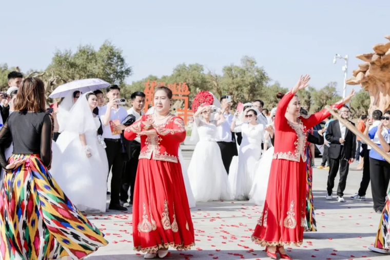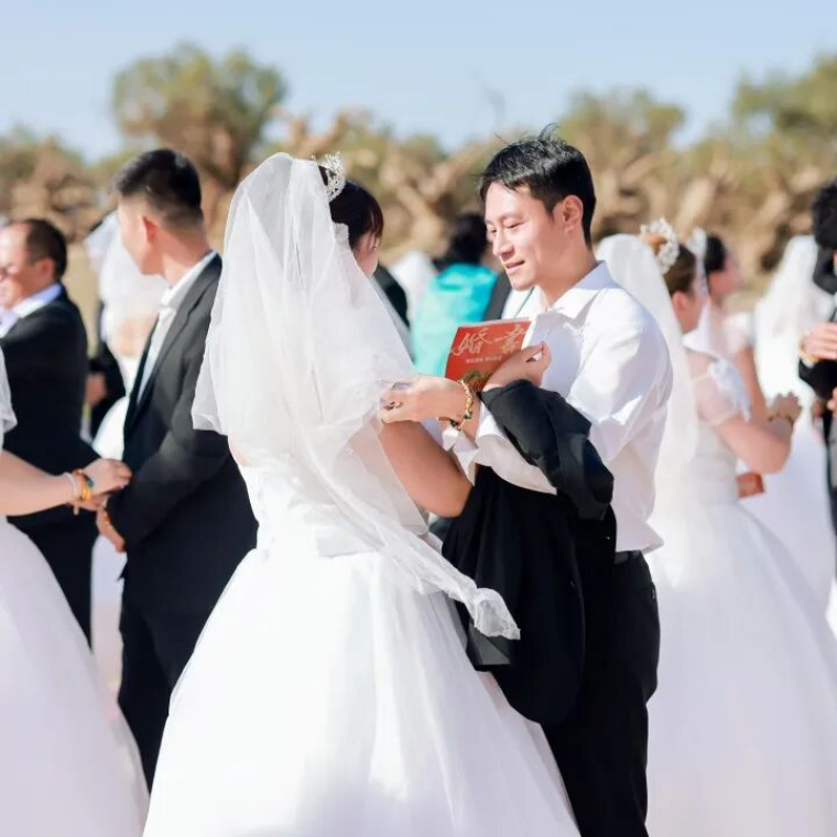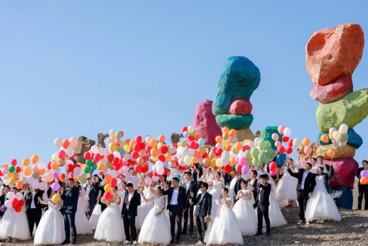 当一对对新人手挽手走过“亿万年”的时光,空气中便弥漫着爱的味道。8月29日七夕节,集团公司在伊吾胡杨景区为50对新人举办“情定胡杨•缘启新程”主题集体婚礼。这场融合了自然之美、爱国情怀、企业精神与人文温情的婚礼,不仅圆了新人们对特色婚礼的向往,更让公司“坚信、坚持、坚守”的企业精神与“艰苦奋斗,自强不息,扎根边疆,甘于奉献”的胡杨精神同频共振,在戈壁之上奏响爱与奋斗的乐章。