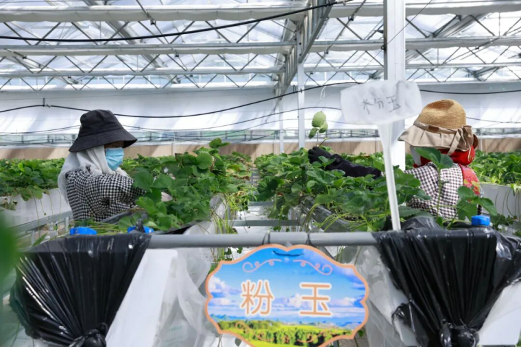 不远处的草莓种苗床,各类品种的草莓幼苗舒展着嫩绿的叶片,一排排整齐排列在“空中”,技术人员手持间苗工具穿梭其间,小心翼翼地拔除弱苗,确保每株幼苗都有充足生长空间。阳光透过玻璃穹顶洒下,与自动喷灌系统喷出的细密水雾交织成虹,映照着幼苗蓬勃的生机。