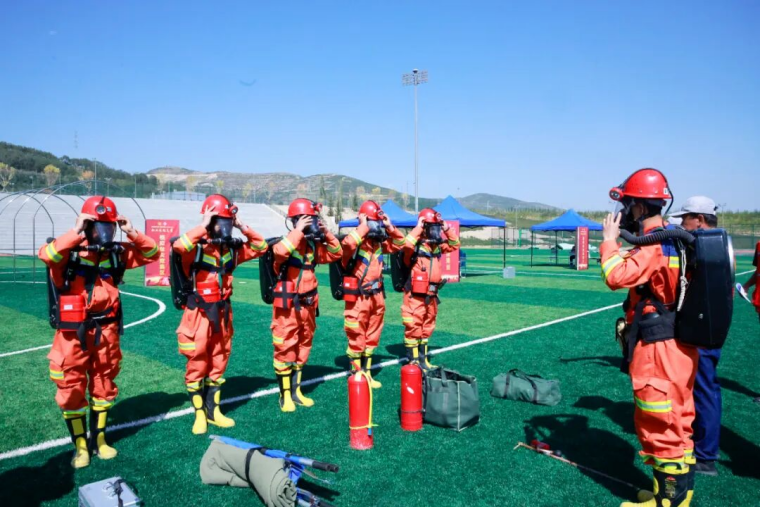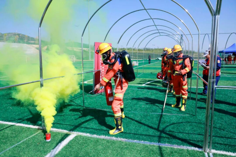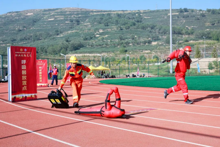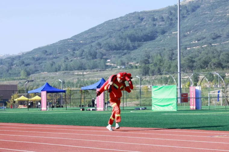 当天,竞赛现场气氛紧张而热烈,参赛选手们个个精神饱满,彰显着应急救援队伍的昂扬斗志和专业素养。理论知识考核环节,参赛人员沉着应战、认真答题,充分展现丰富的应急救援理论知识储备和沉着的应变能力。技能操作竞赛环节,参赛选手一刻不停,先佩戴氧气呼吸器完成100米跑,再肩扛30KG训练假人完成100米跑,然后双手各持8KG灭火器完成100米跑,最后完成100米综合障碍跑,力量、速度与灵敏完美结合;现场破拆时,当裁判鸣哨启动计时,参赛选手拿着木工手锯冲向10cm*10cm方木,用尽全力以最快速度将方木锯断,青筋凸起、大汗淋漓。
